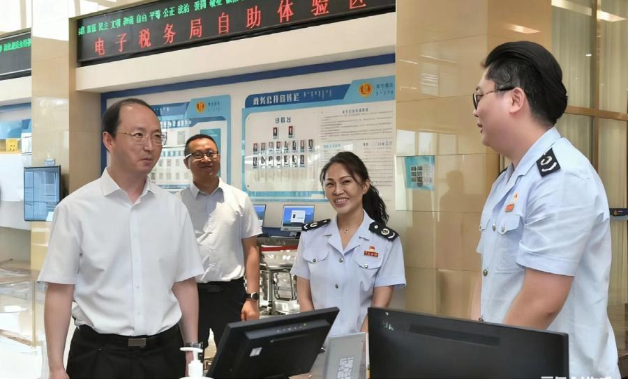 国家税务总局内蒙古自治区税务局党委书记、局长李俊珅(左一)在乌兰察布市集宁区税务局实地察看12366 热线一体化升级建设进展,并与来自北京市顺义区的互派青年税务干部交谈 李立新 摄