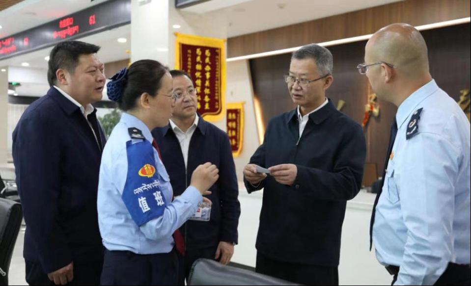 国家税务总局青海省税务局党委书记、局长谭中伟(右二)到基层办税服务厅调研有关业务办理、数据运用情况,详细了解结合民族地区实际制作的税费种基础申报辅导卡片