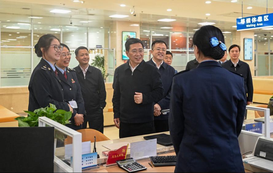 国家税务总局山东省税务局党委书记、局长王跃伟(左四)在潍坊市调研期间实地走访办税服务厅,摸实情、察民意、解难题,慰问一线税务干部 丁齐/摄