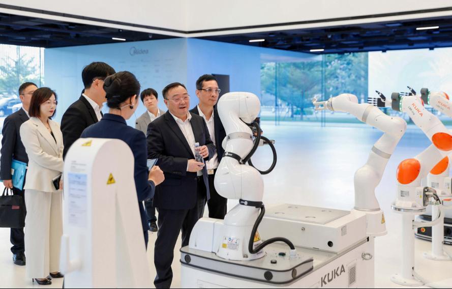 国家税务总局广东省税务局党委书记、局长江武峰(右二)到美的集团实地调研,详细了解企业生产经营、研发创新情况,听取涉税诉求建议