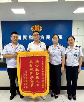王朝阳(左一)为纳税人耐心解答政策,解决难题,帮助纳税人享受税收优惠政策,得到纳税人的认可